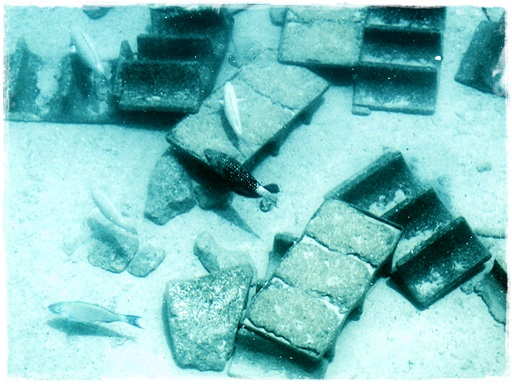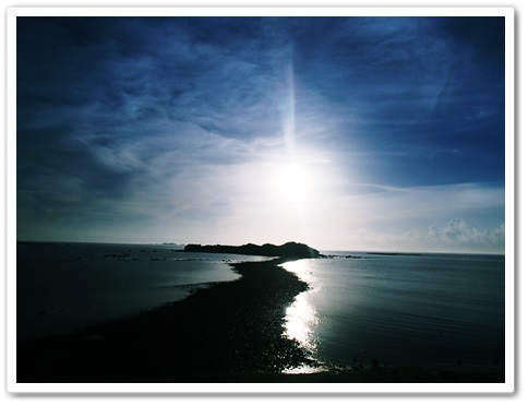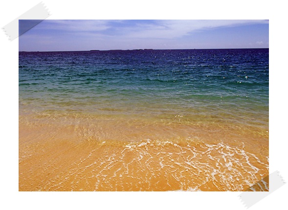 The sky was blue. The sea was also blue and so clear that I could see the shadows of fish.